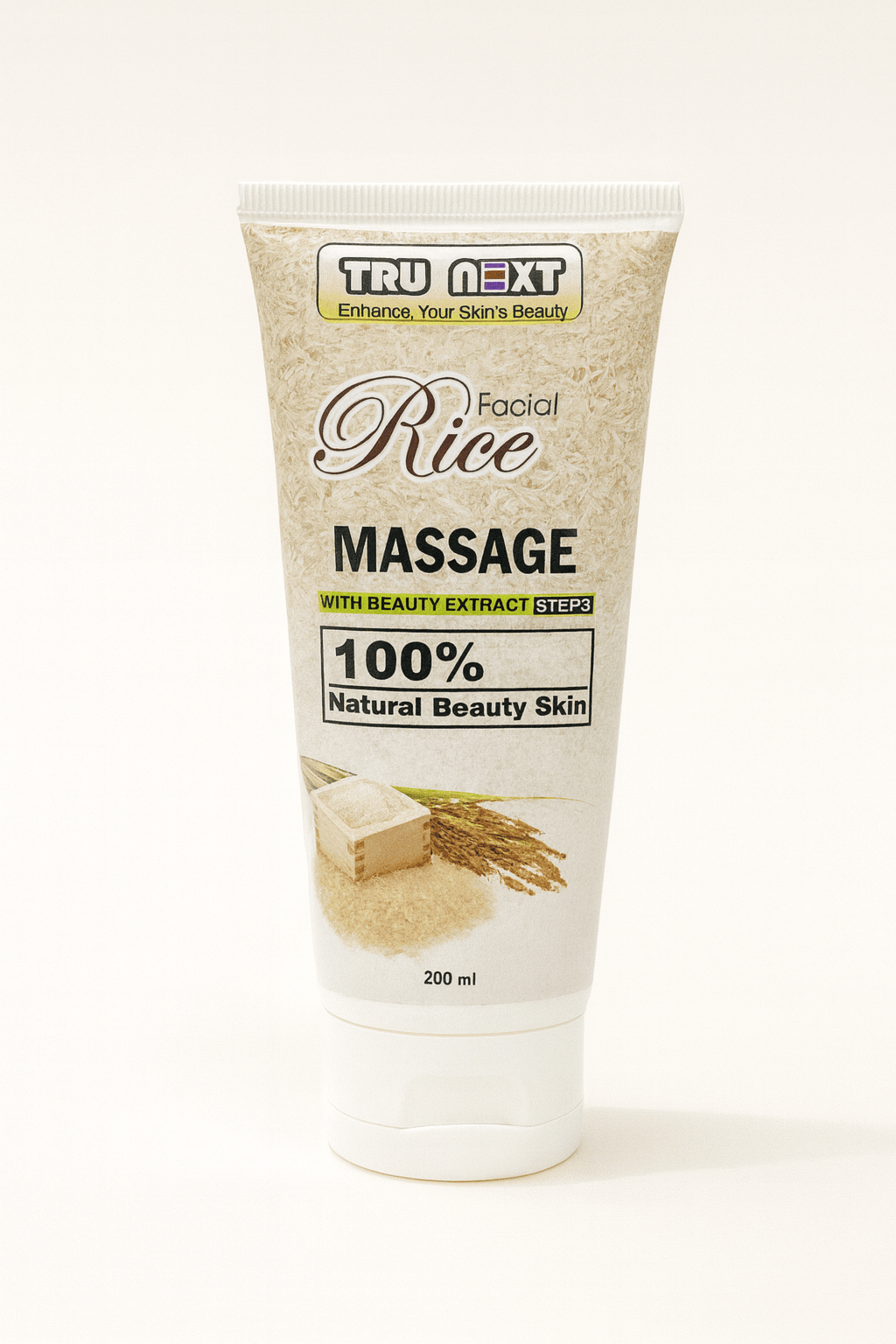 Indulge your skin in luxurious care with Tru Next Rice Facial Massage, enriched with rice extracts, vitamins, and natural moisturizers that deeply nourish and rejuvenate. This creamy formula glides effortlessly over the skin, helping to improve blood circulation, enhance skin elasticity, and promote a natural, healthy glow.